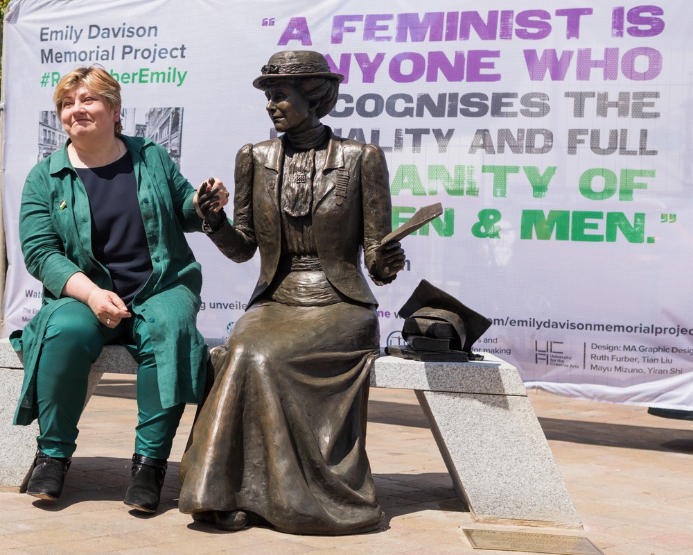 A closer look at the statue reveals a wealth of detail about the life of this remarkable woman. Davison wears a hunger strike medal with seven stripes representing the seven times she was imprisoned, most notably at Strangeways and Holloway Prison. She holds a census form and mortar board (Davison, a teacher, was honoured with a first class degree at St Hugh’s College, Oxford, but was unable to graduate – this was an award only extended to women in 1920.) Beside her are three pertinent books: The Bible, Leaves of Grass by poet Walt Whitman and Chaucer’s A Golden Key.